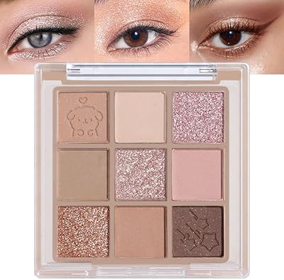 “9-color eyeshadow palette in rose gold, brown, nude, and neutral shades. Highly pigmented, long-lasting, and waterproof. Korean-style natural, naked look makeup. Shimmer and matte finish. Perfect for everyday, natural-looking eyes.”